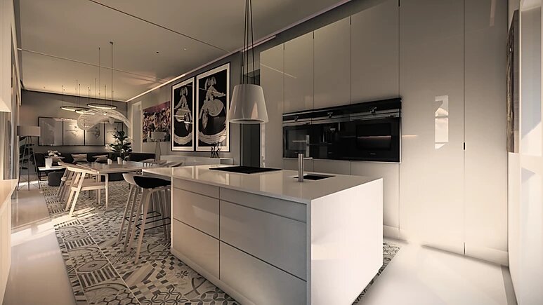 La cocina podrá estar abierta al salón-comedor o cerrada en un espacio independiente, según prefiera el comprador. La cocina será de la firma Porcelanosa o Bulthaup e incluirá electrodomésticos de última generación, como un horno digital autolimpiable, una campana extractora, una placa de inducción, un microondas con grill y una nevera integrada de gran tamaño; todo ello en acabado de acero inoxidable de la marca Siemens o Neff.