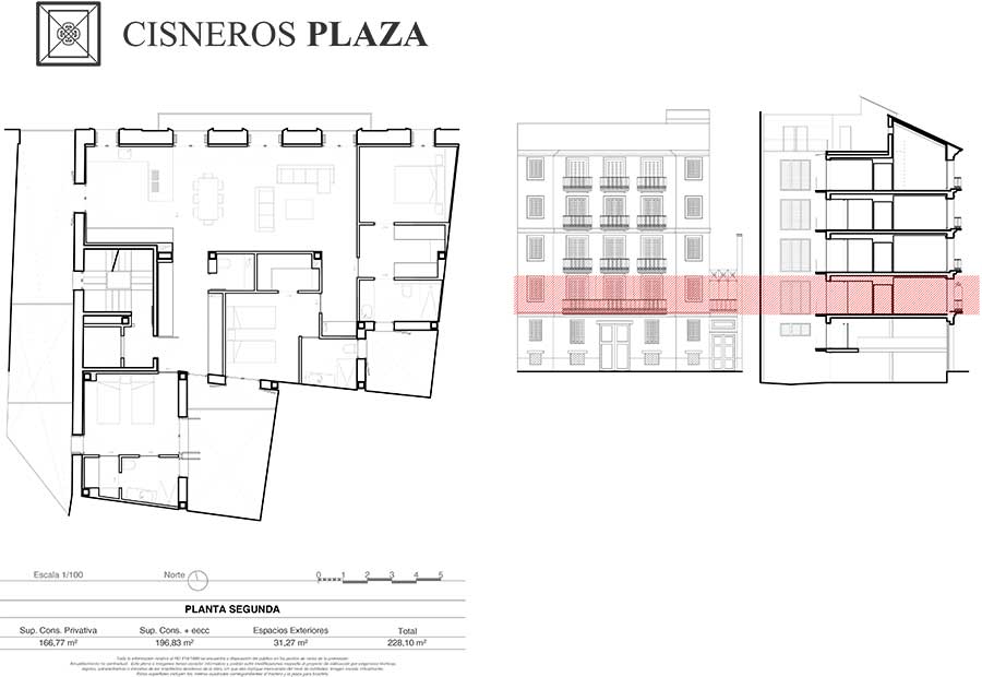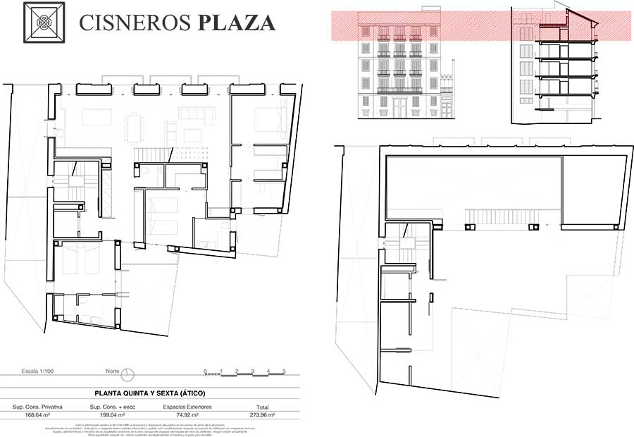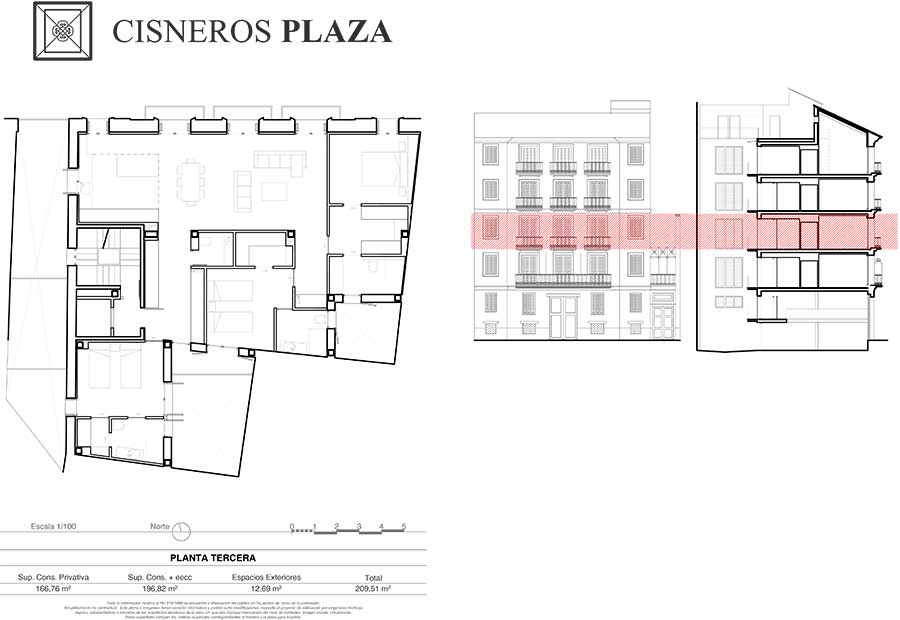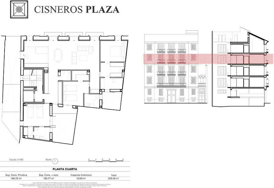 Viviendas de 200/300 m2 de 3 dormitorios, con vestidor y baño en suite. Instalaciones Premium, elegante diseño de interiores y acabados de una calidad excepcional. Ático dúplex con terraza y piscina privada. Cuartos trasteros privados para cada vivienda. Plazas de garaje disponibles con acceso directo a la plaza Cisneros, en edificio de siete plantas de parking con ascensor.