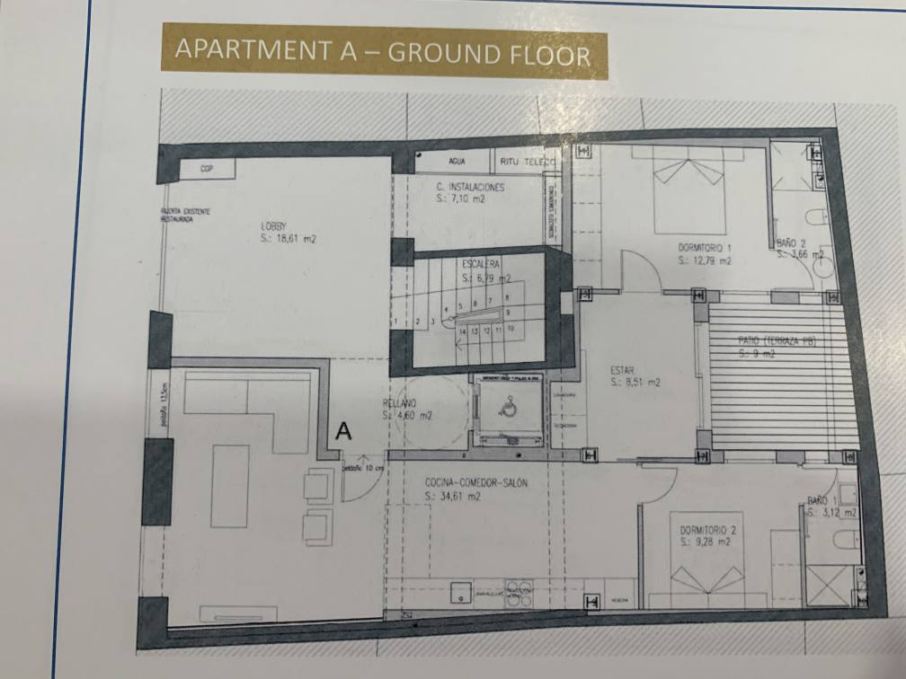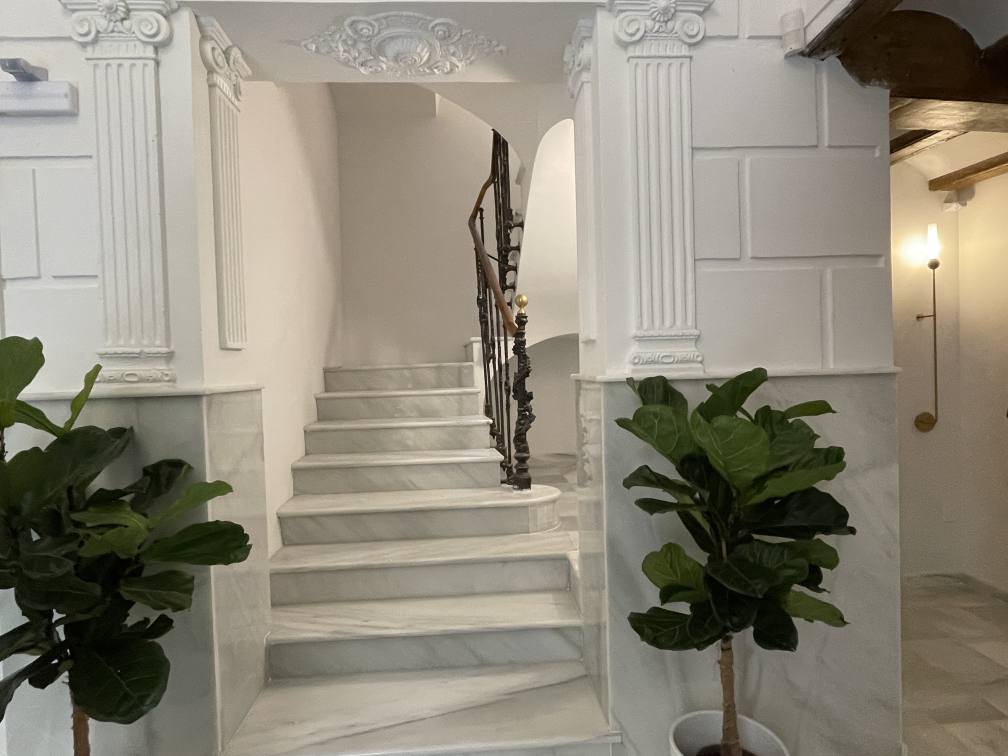 · Pavimento de mármol macael blanco-gris en zaguán, con recuperación de pavimento hidráulico original en forma de alfombra central.