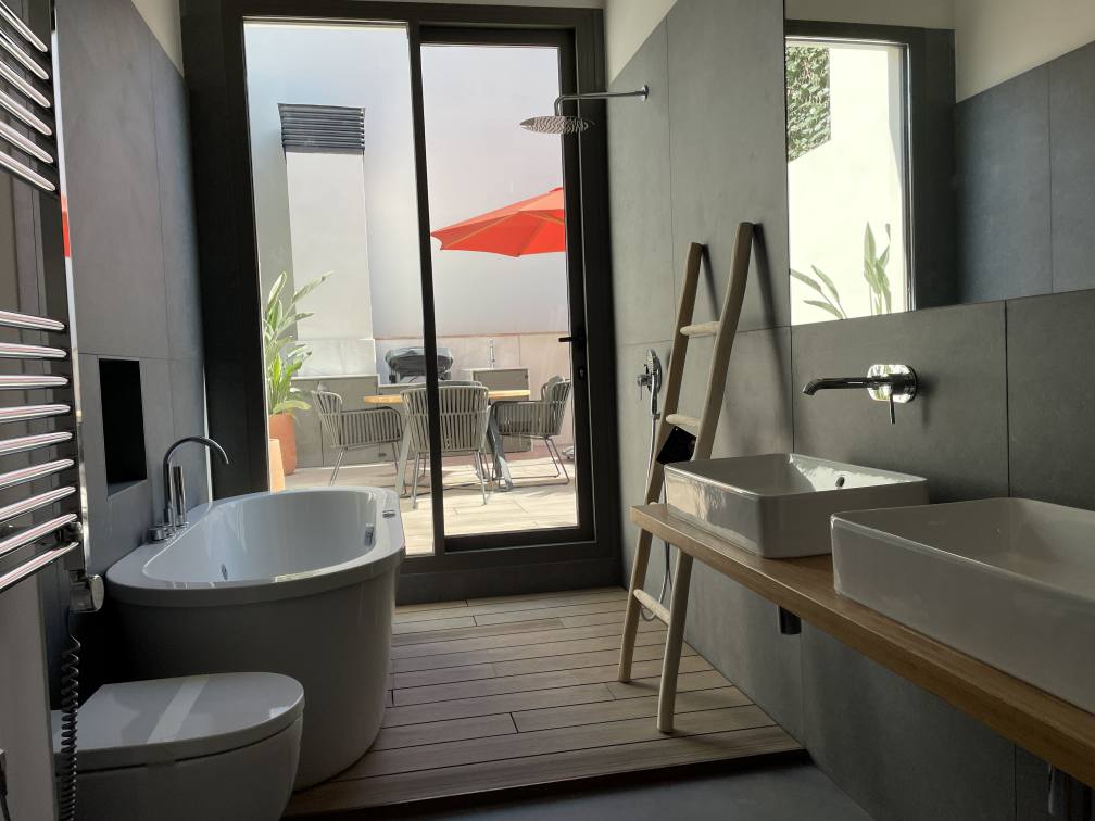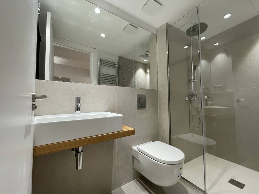 · Pavimento de baños en porcelánico de 1ª calidad y gran formato, modelo Noon Grey y Beige de Living Ceramics.