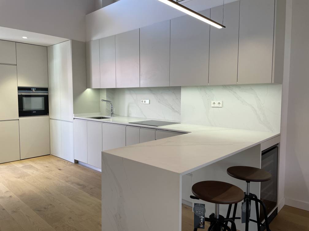 · Bancadas de cocina y frontal de cuarzo sintético, de Silestone, modelo Unique Calacatta Glacé Finished, iluminadas mediante tira LED desde la parte inferior del mueble alto.