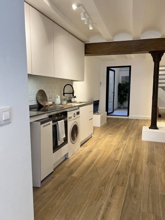 Como podéis observar, la reforma se hizo sacando muros originales lo máximo posible, suelo de parquet y suelo cerámico de incitación de madera.